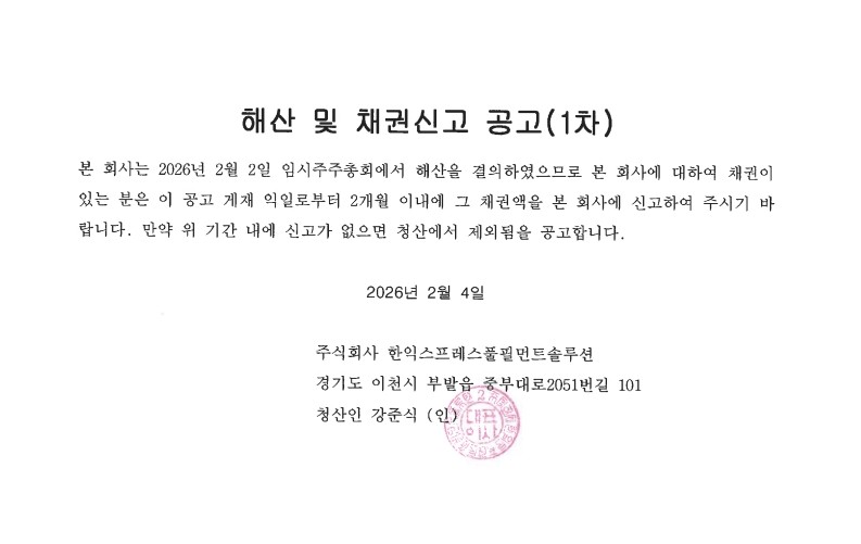 해산 및 채권신고 공고(1차)