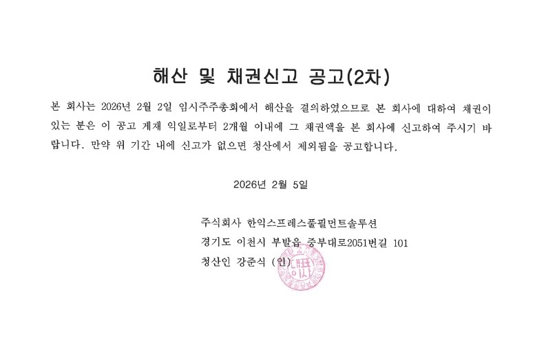 해산 및 채권신고 공고(2차)